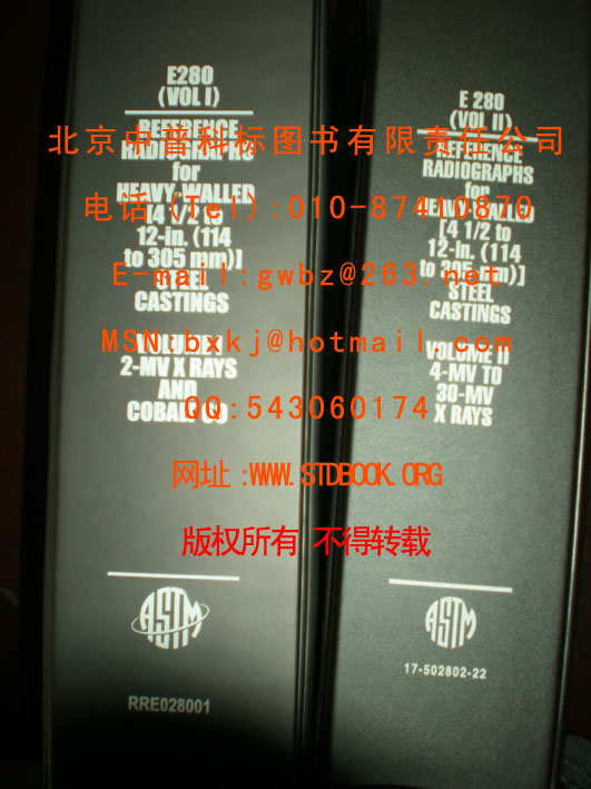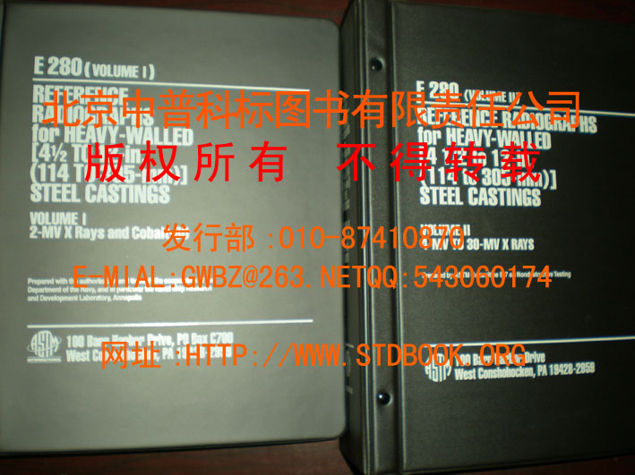 钢铸件标准参考射线照片共有三个厚度范围.E446-98(R2004)钢铸件厚度小于或等于2in(51MM)的标准参考射线照片;E186-98(R2004)钢铸件厚壁2-4二分之一2in(51-114MM)的标准参考射线照片;E280钢铸件厚壁4又二分之一-12in(114-305MM)的标准参考射线照片,上述E446和E186最为常用.再者标题的厚度范围并不是限制性的,只要供需双方协商一致,不在厚度范围内的钢铸件也可以使用该二标准.