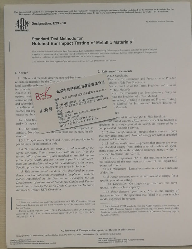 所属分类:首页 >> 国外进口出版物 >> 进口版ASTM标准+图谱 >> 进口正版 ASTM E23-2018 金属材料缺口试样标准冲击试验方法