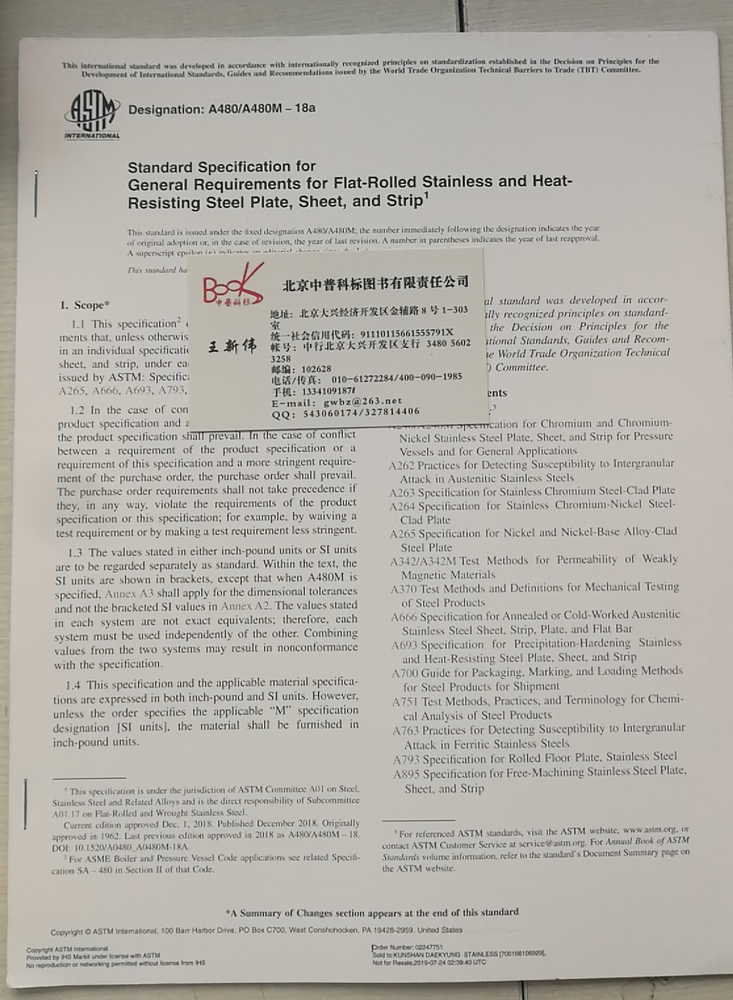 进口原版ASTM A480/A480M Revision 18A, December 1, 2018